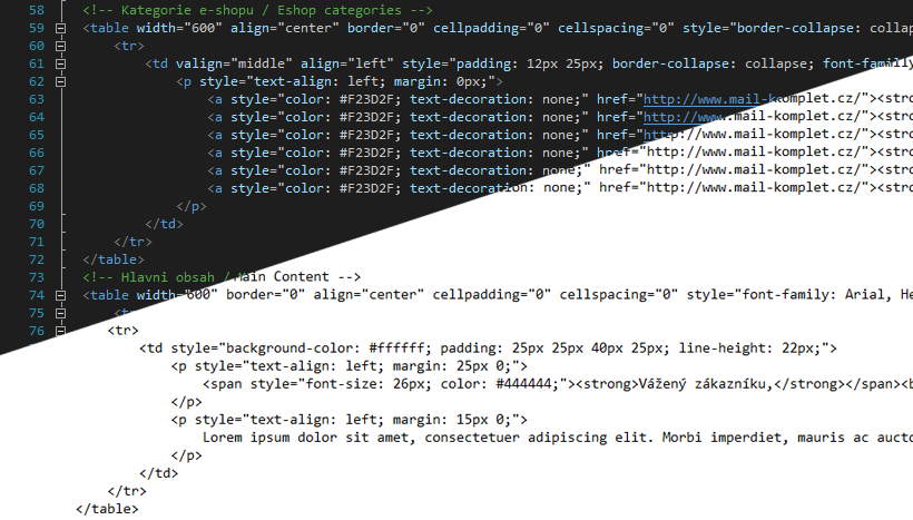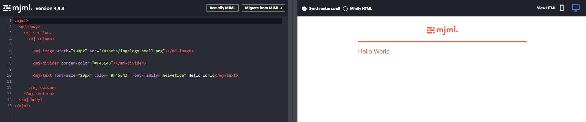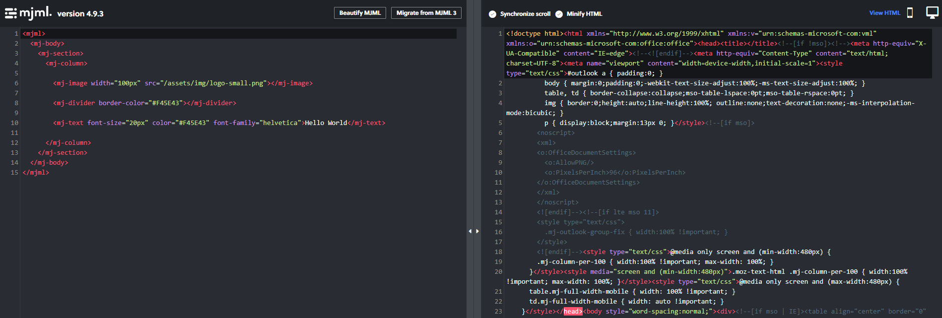 MJML Vám nabízí přehledný zápis kódu pomocí speciálních značek, který částečně kopíruje HTML strukturu. Tak jak jsme se zmínili v úvodu, hotový zápis kódu je následně jedním klikem převeden do tabulkového zápisu, inline stylů a podmíněných zápisů. Díky tomu se dosáhne maximální responzivity.