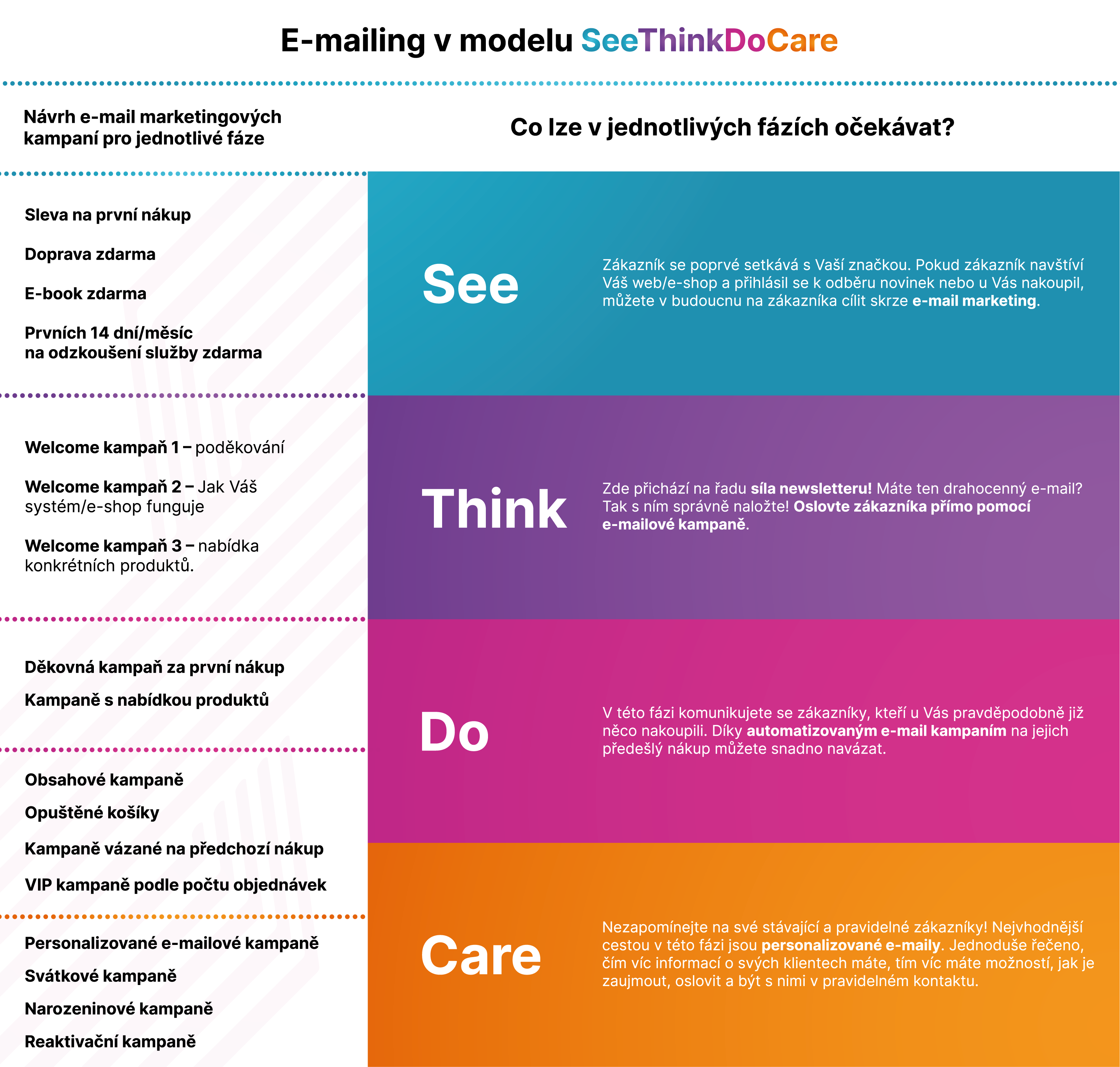 Pokud si celý proces zrekapitulujeme, zjistíme, že je velmi jednoduchý. Každý krok má své opodstatnění. Nejdříve musíte zaujmout, dostat Vaši značku do povědomí (See). Zákazníci Vás musí nejprve poznat než o Vás a Vašich produktech začnou vážně uvažovat (Think). Až posléze dojdou k rozhodnutí, kdy od Vás něco nakoupí (Do). Poslední krok souvisí s Vašim skutečným zájmem o Vaši skutečnou cílovou skupinu a jakým způsobem se o ně staráte a udržujete s nimi kontakt (Care).